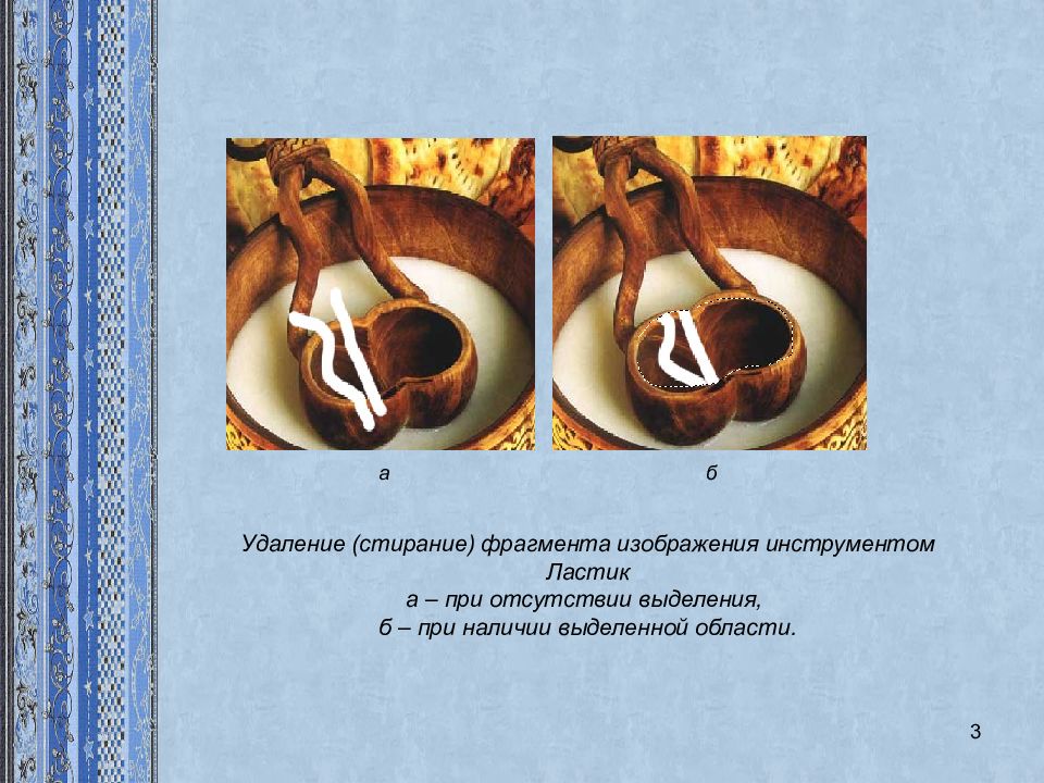 а Удаление (стирание) фрагмента изображения инструментом Ластик а – при отсутствии выделения, б – при наличии выделенной области. б 3