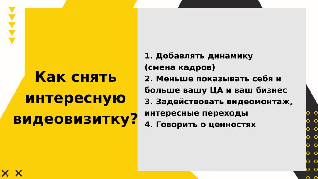 Как снять и нтересную в идеовизитку ? Добавлять динамику (смена кадров) 2. Меньше показывать себя и больше вашу ЦА и ваш бизнес 3. Задействовать видеомонтаж, и нтересные переходы 4. Говорить о ценностях