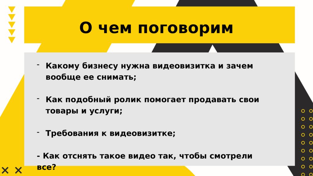 О чем поговорим Какому бизнесу нужна видеовизитка и зачем вообще ее снимать ; Как подобный ролик помогает продавать свои товары и услуги ; Требования к видеовизитке ; - Как отснять такое видео так, чтобы смотрели все?