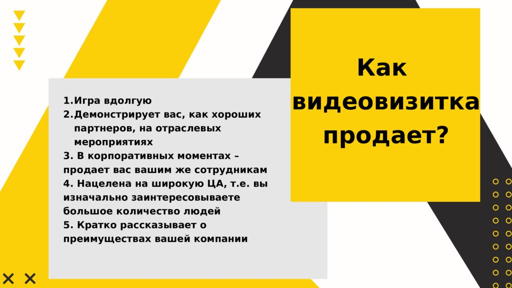 Как видеовизитка продает? Игра вдолгую Демонстрирует вас, как хороших партнеров, на отраслевых мероприятиях 3. В корпоративных моментах – продает вас вашим же сотрудникам 4. Нацелена на широкую ЦА, т.е. вы изначально заинтересовываете большое количество людей 5. Кратко рассказывает о преимуществах вашей компании