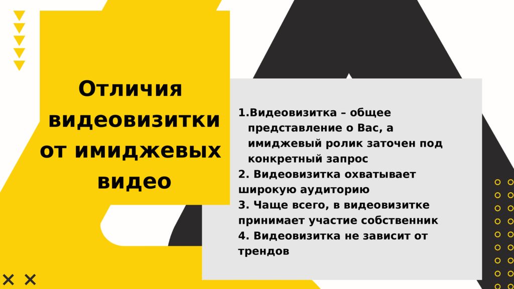 Отличия видеовизитки от имиджевых видео Видеовизитка – общее представление о Вас, а имиджевый ролик заточен под конкретный запрос 2. Видеовизитка охватывает широкую аудиторию 3. Чаще всего, в видеовизитке принимает участие собственник 4. Видеовизитка не зависит от трендов