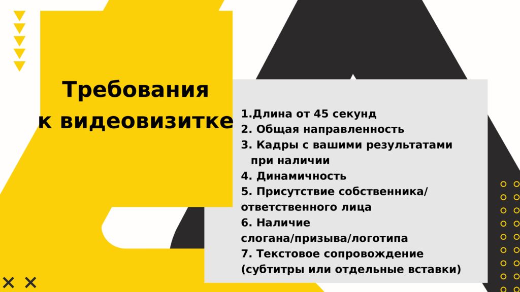 Требования к видеовизитке Длина от 45 секунд Общая направленность Кадры с вашими результатами при наличии Динамичность Присутствие собственника/ о тветственного лица 6. Наличие слогана/призыва/логотипа 7. Текстовое сопровождение (субтитры или отдельные вставки)