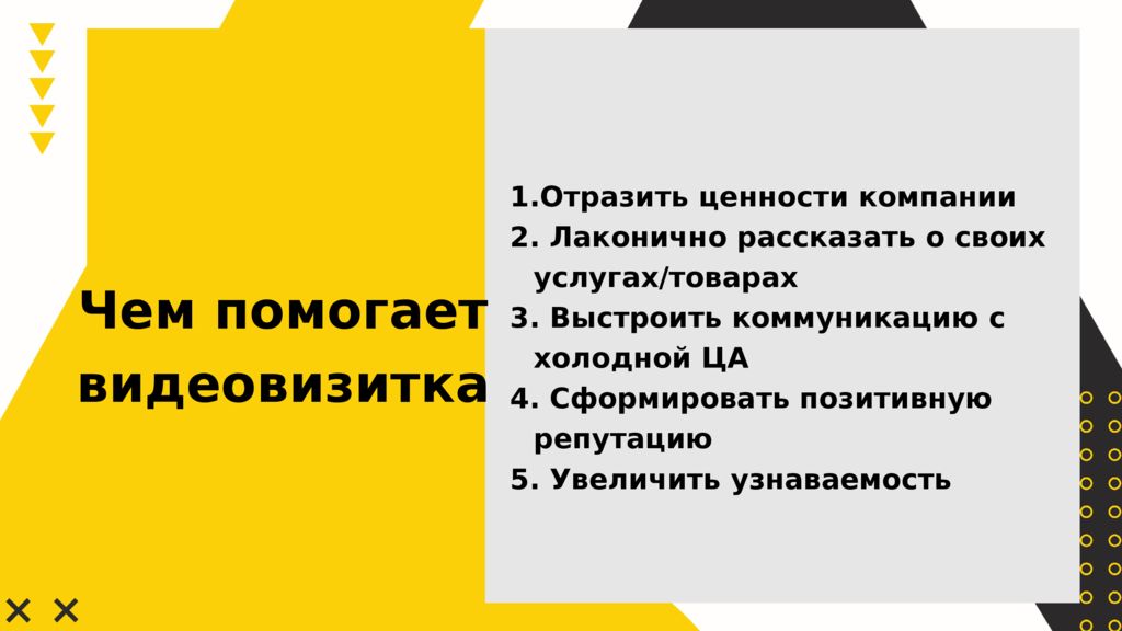 Чем помогает видеовизитка Отразить ценности компании Лаконично рассказать о своих услугах/товарах Выстроить коммуникацию с холодной ЦА Сформировать позитивную репутацию Увеличить узнаваемость