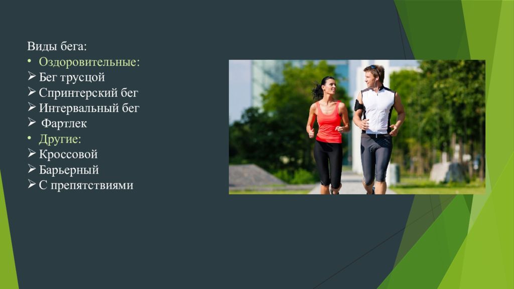Виды бега: Оздоровительные: Бег трусцой Спринтерский бег Интервальный бег Фартлек Другие: Кроссовой Барьерный С препятствиями