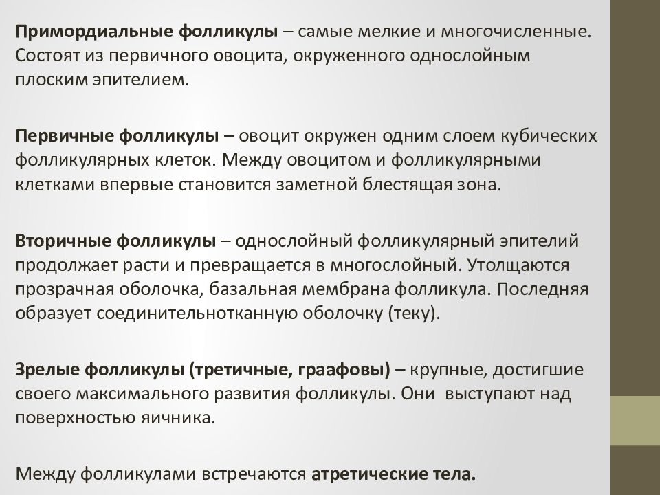 Примордиальные фолликулы – самые мелкие и многочисленные. Состоят из первичного овоцита, окруженного однослойным плоским эпителием. Первичные фолликулы – овоцит окружен одним слоем кубических фолликулярных клеток. Между овоцитом и фолликулярными клетками впервые становится заметной блестящая зона. Вторичные фолликулы – однослойный фолликулярный эпителий продолжает расти и превращается в многослойный. Утолщаются прозрачная оболочка, базальная мембрана фолликула. Последняя образует соединительнотканную оболочку (теку ). Зрелые фолликулы (третичные, граафовы ) – крупные, достигшие своего максимального развития фолликулы. Они выступают над поверхностью яичника. Между фолликулами встречаются атретические тела.
