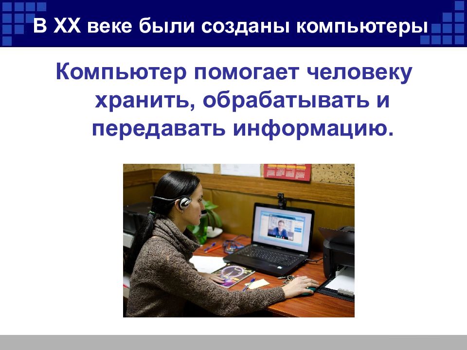 Компьютер помогает человеку хранить, обрабатывать и передавать информацию. В XX веке были созданы компьютеры