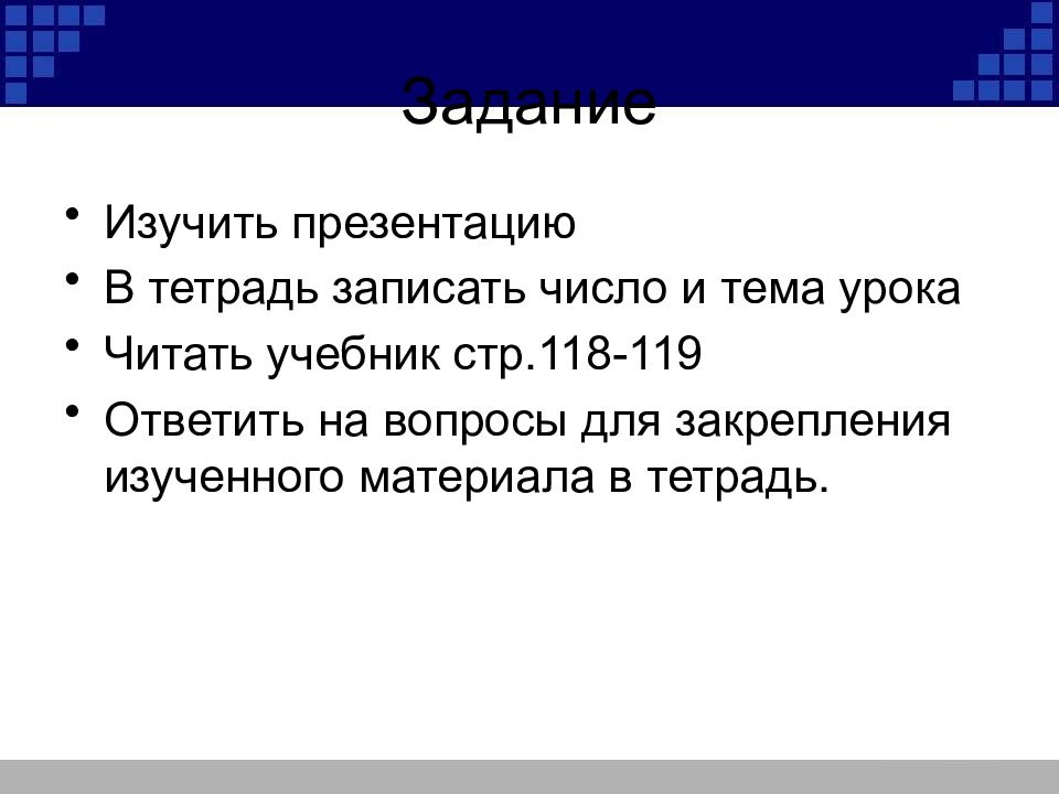 Изучить презентацию В тетрадь записать число и тема урока Читать учебник стр.118-119 Ответить на вопросы для закрепления изученного материала в тетрадь.