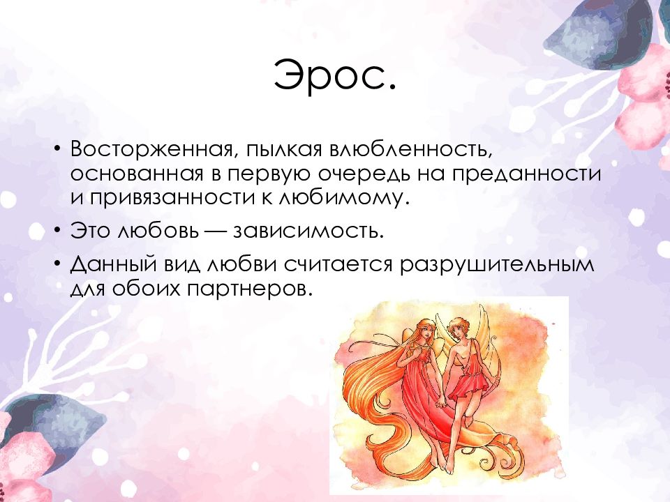 Восторженная, пылкая влюбленность, основанная в первую очередь на преданности и привязанности к любимому. Это любовь — зависимость. Данный вид любви считается разрушительным для обоих партнеров.