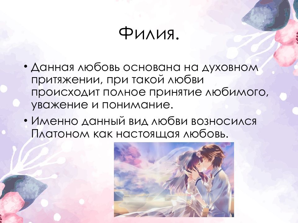 Данная любовь основана на духовном притяжении, при такой любви происходит полное принятие любимого, уважение и понимание. Именно данный вид любви возносился Платоном как настоящая любовь.