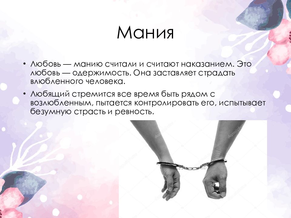 Любовь — манию считали и считают наказанием. Это любовь — одержимость. Она заставляет страдать влюбленного человека. Любящий стремится все время быть рядом с возлюбленным, пытается контролировать его, испытывает безумную страсть и ревность.