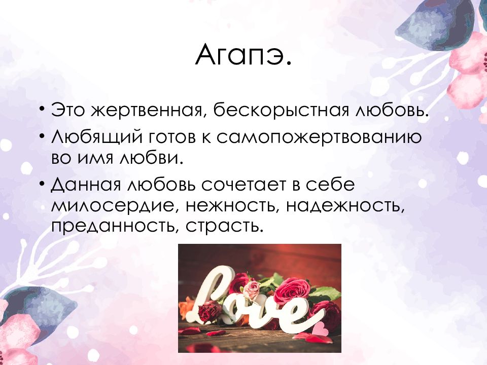 Это жертвенная, бескорыстная любовь. Любящий готов к самопожертвованию во имя любви. Данная любовь сочетает в себе милосердие, нежность, надежность, преданность, страсть.