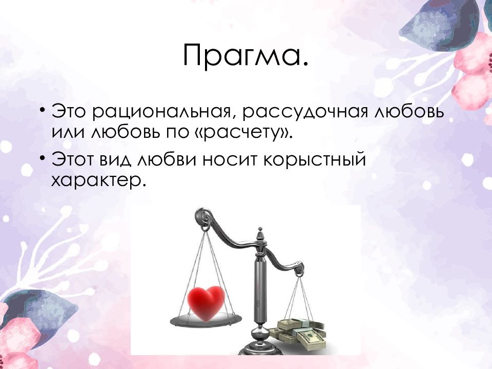 Это рациональная, рассудочная любовь или любовь по «расчету». Этот вид любви носит корыстный характер.