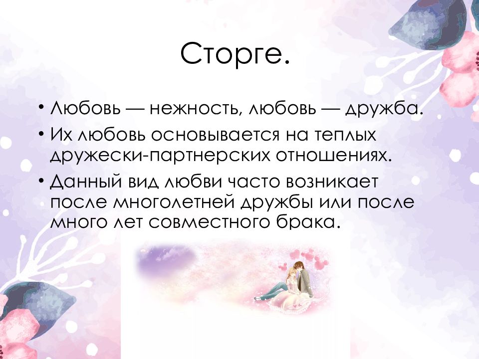 Любовь — нежность, любовь — дружба. Их любовь основывается на теплых дружески-партнерских отношениях. Данный вид любви часто возникает после многолетней дружбы или после много лет совместного брака.