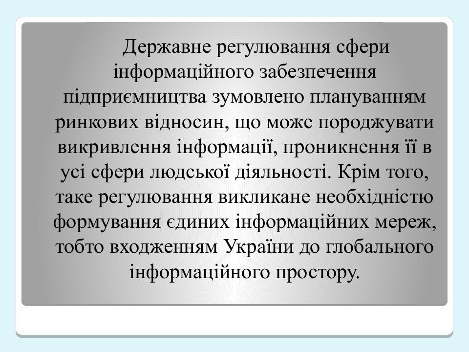 Державне регулювання сфери інформаційного забезпечення підприємництва зумовлено плануванням ринкових відносин, що може породжувати викривлення інформації, проникнення її в усі сфери людської діяльності. Крім того, таке регулювання викликане необхідністю формування єдиних інформаційних мереж, тобто входженням України до глобального інформаційного простору.