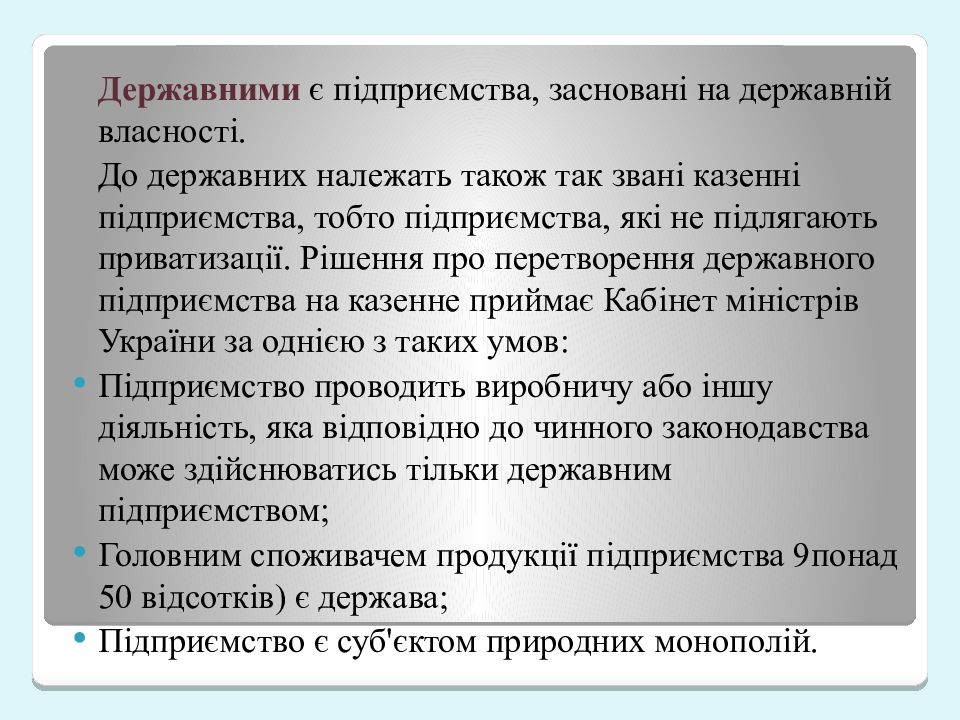 Державними є підприємства, засновані на державній власності. До державних належать також так звані казенні підприємства, тобто підприємства, які не підлягають приватизації. Рішення про перетворення державного підприємства на казенне приймає Кабінет міністрів України за однією з таких умов: Підприємство проводить виробничу або іншу діяльність, яка відповідно до чинного законодавства може здійснюватись тільки державним підприємством; Головним споживачем продукції підприємства 9понад 50 відсотків) є держава; Підприємство є суб'єктом природних монополій.
