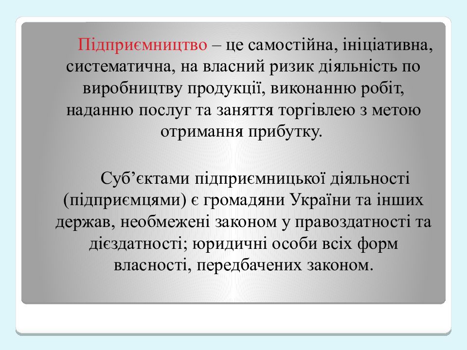 Підприємництво – це самостійна, ініціативна, систематична, на власний ризик діяльність по виробництву продукції, виконанню робіт, наданню послуг та заняття торгівлею з метою отримання прибутку. Суб’єктами підприємницької діяльності ( підприємцями ) є громадяни України та інших держав, необмежені законом у правоздатності та дієздатності ; юридичні особи всіх форм власності, передбачених законом.