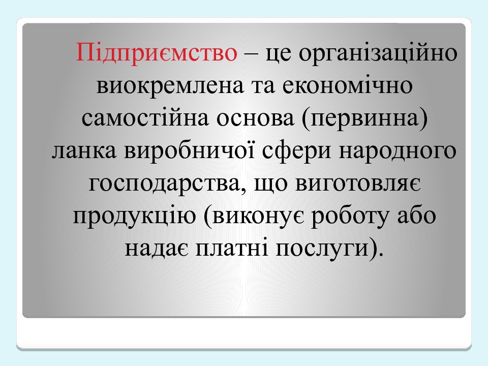 Підприємство – це організаційно виокремлена та економічно самостійна основа (первинна) ланка виробничої сфери народного господарства, що виготовляє продукцію (виконує роботу або надає платні послуги).