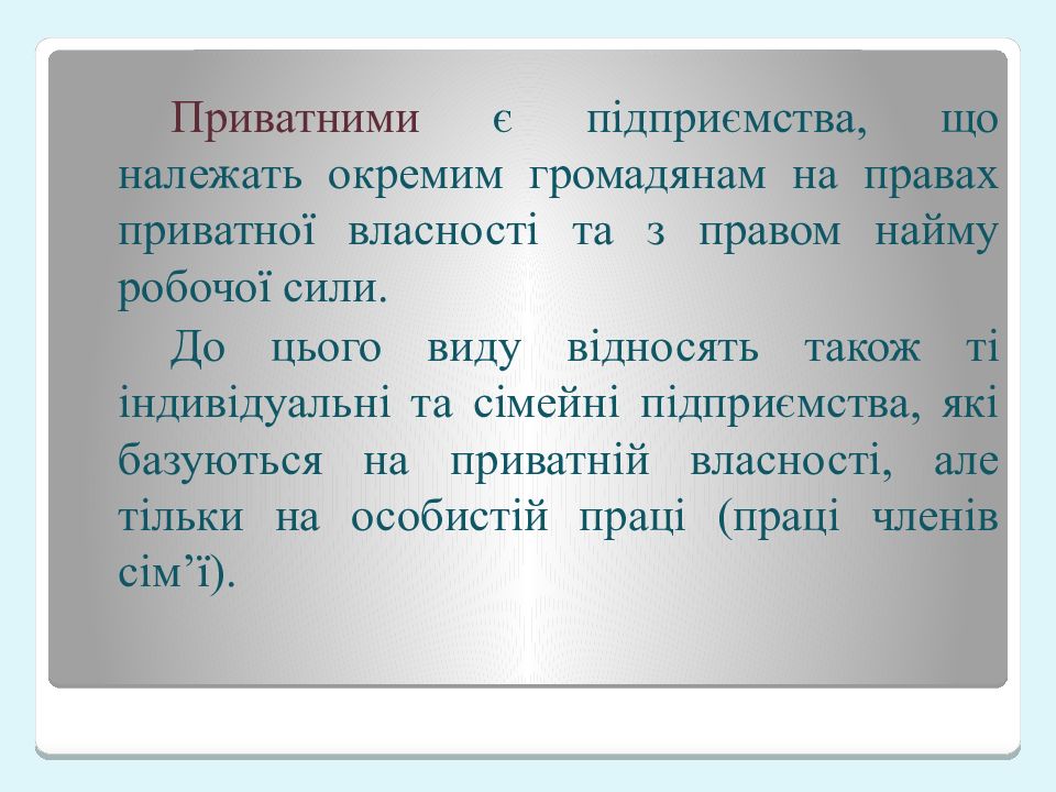 Приватними є підприємства, що належать окремим громадянам на правах приватної власності та з правом найму робочої сили. До цього виду відносять також ті індивідуальні та сімейні підприємства, які базуються на приватній власності, але тільки на особистій праці ( праці членів сім ’ ї).