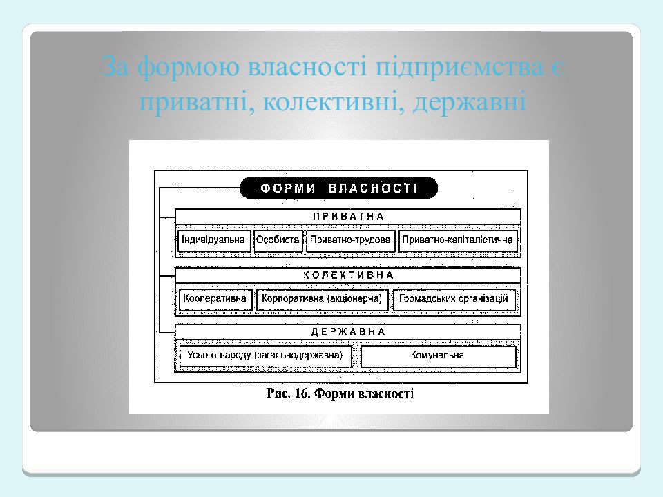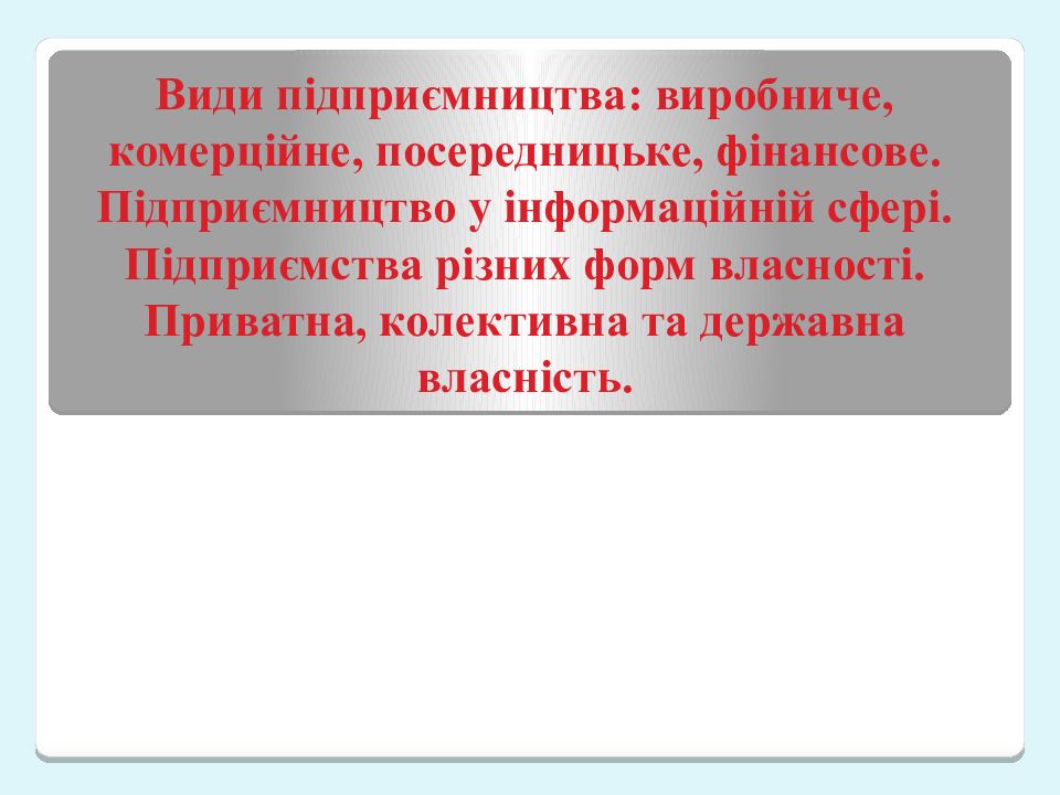 Первый слайд презентации: Види підприємництва: виробниче, комерційне, посередницьке, фінансове. Підприємництво у інформаційній сфері. Підприємства різних форм власності. Приватна, колективна та державна власність