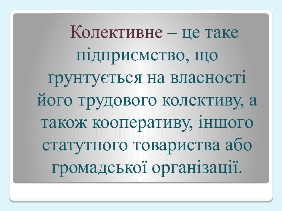 Колективне – це таке підприємство, що ґрунтується на власності його трудового колективу, а також кооперативу, іншого статутного товариства або громадської організації.