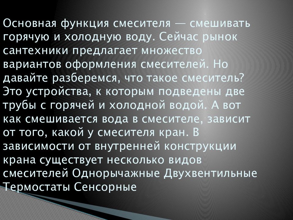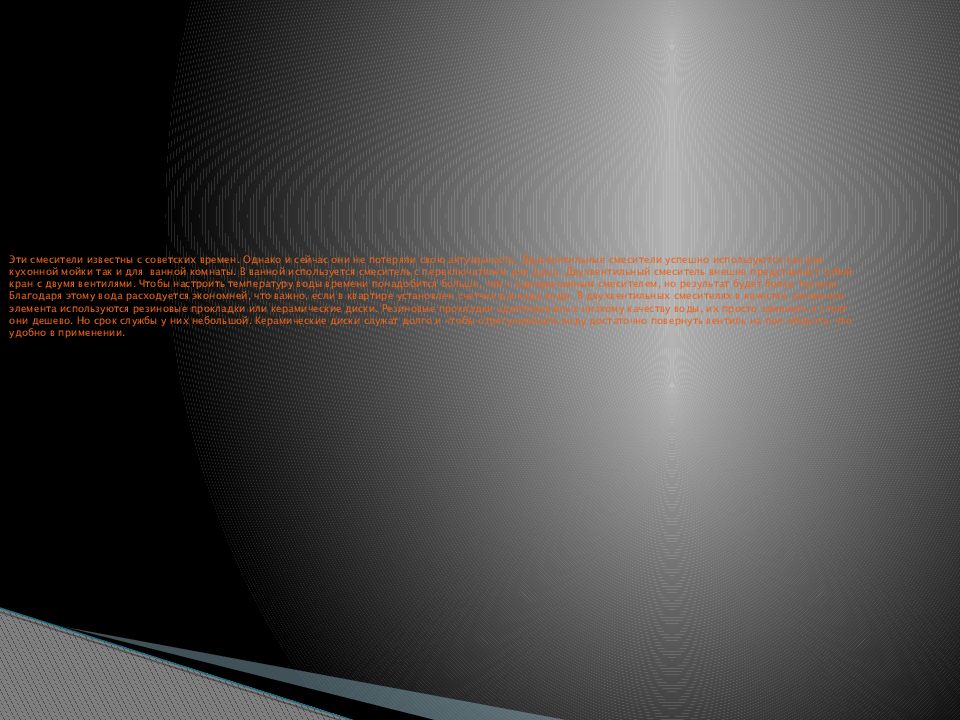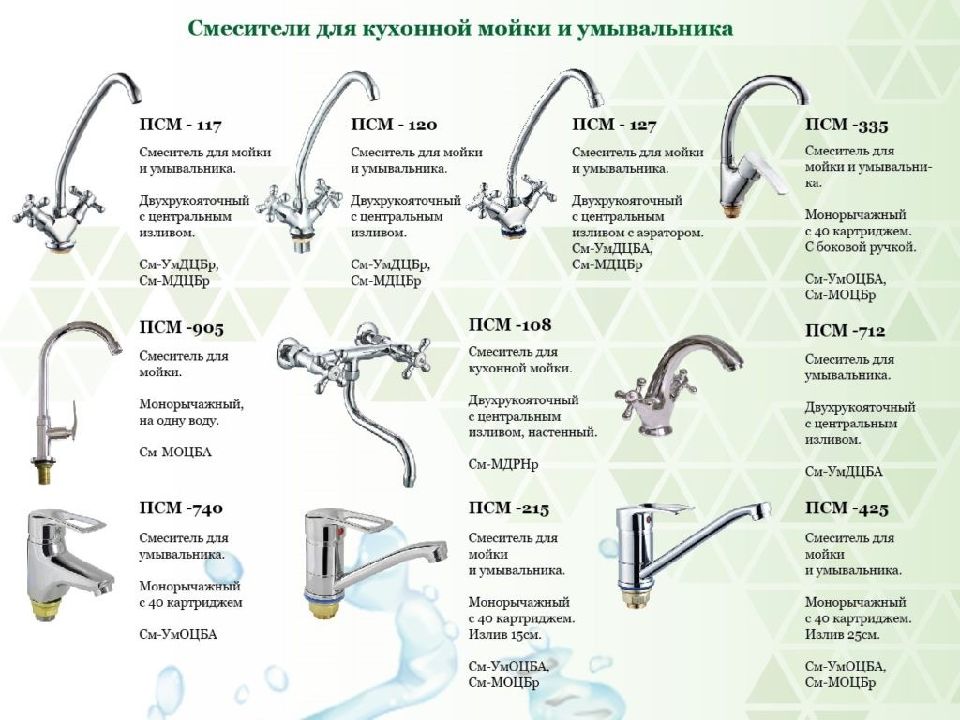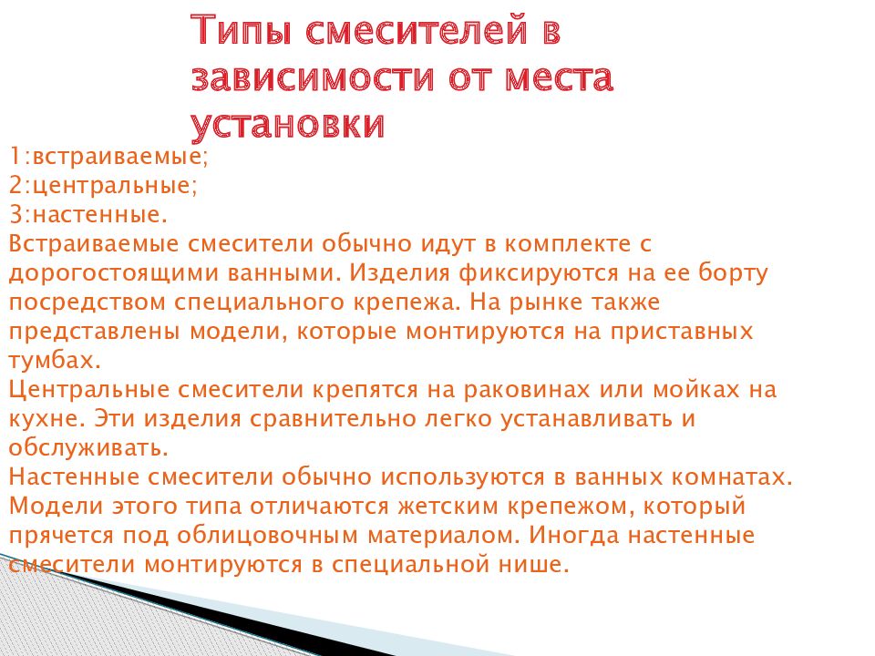 Типы смесителей в зависимости от места установки 1: встраиваемые; 2: центральные; 3: настенные. Встраиваемые смесители обычно идут в комплекте с дорогостоящими ванными. Изделия фиксируются на ее борту посредством специального крепежа. На рынке также представлены модели, которые монтируются на приставных тумбах. Центральные смесители крепятся на раковинах или мойках на кухне. Эти изделия сравнительно легко устанавливать и обслуживать. Настенные смесители обычно используются в ванных комнатах. Модели этого типа отличаются жетским крепежом, который прячется под облицовочным материалом. Иногда настенные смесители монтируются в специальной нише.