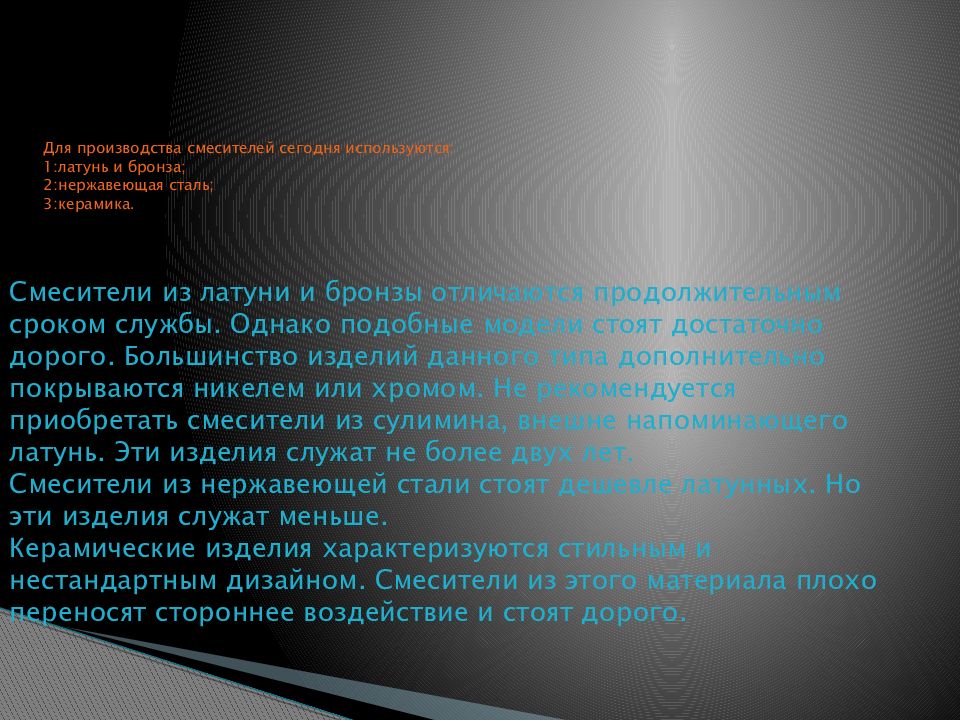Слайд 11: Для производства смесителей сегодня используются: 1 : латунь и бронза; 2: нержавеющая сталь; 3: керамика