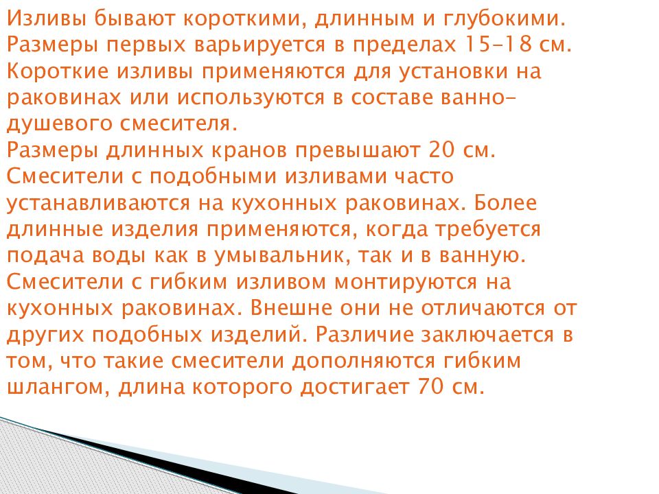 Изливы бывают короткими, длинным и глубокими. Размеры первых варьируется в пределах 15-18 см. Короткие изливы применяются для установки на раковинах или используются в составе ванно-душевого смесителя. Размеры длинных кранов превышают 20 см. Смесители с подобными изливами часто устанавливаются на кухонных раковинах. Более длинные изделия применяются, когда требуется подача воды как в умывальник, так и в ванную. Смесители с гибким изливом монтируются на кухонных раковинах. Внешне они не отличаются от других подобных изделий. Различие заключается в том, что такие смесители дополняются гибким шлангом, длина которого достигает 70 см.