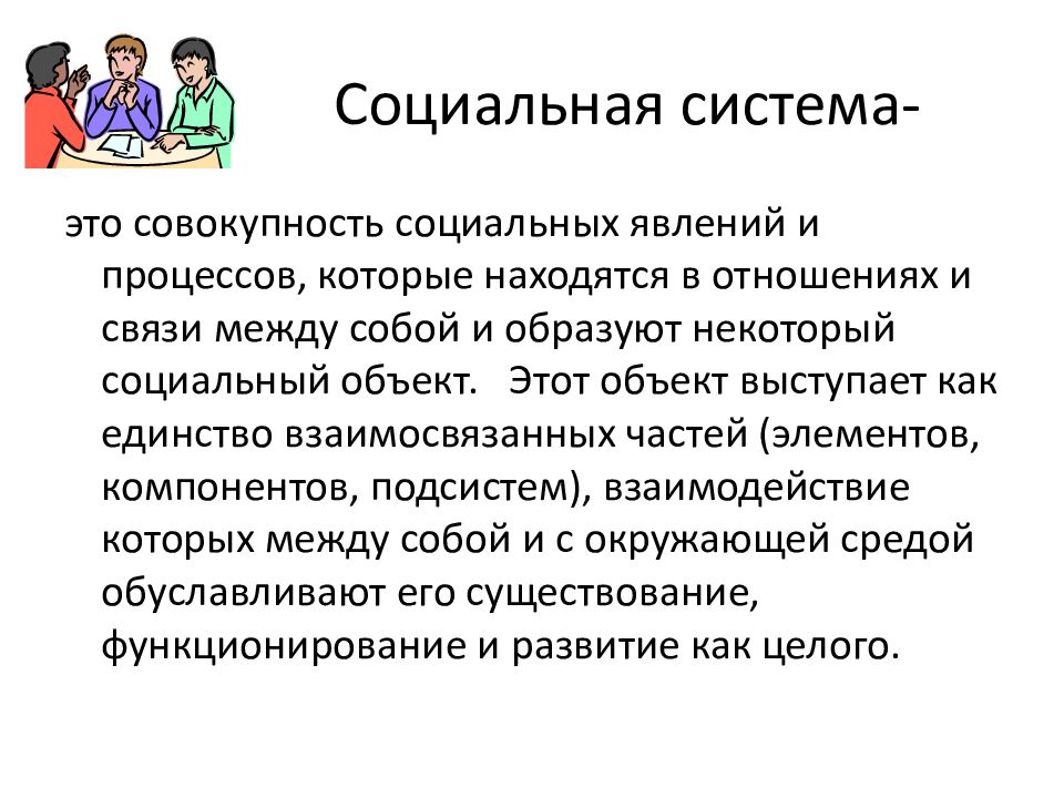 это совокупность социальных явлений и процессов, которые находятся в отношениях и связи между собой и образуют некоторый социальный объект. Этот объект выступает как единство взаимосвязанных частей (элементов, компонентов, подсистем), взаимодействие которых между собой и с окружающей средой обуславливают его существование, функционирование и развитие как целого.