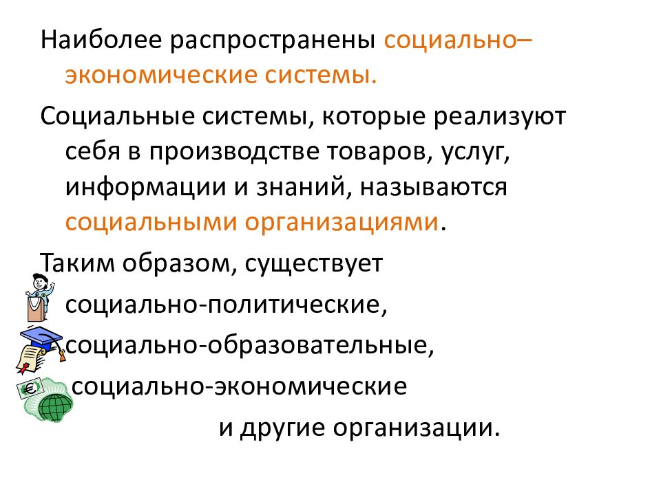 Наиболее распространены социально–экономические системы. Социальные системы, которые реализуют себя в производстве товаров, услуг, информации и знаний, называются социальными организациями. Таким образом, существует социально-политические, социально-образовательные, социально-экономические и другие организации.