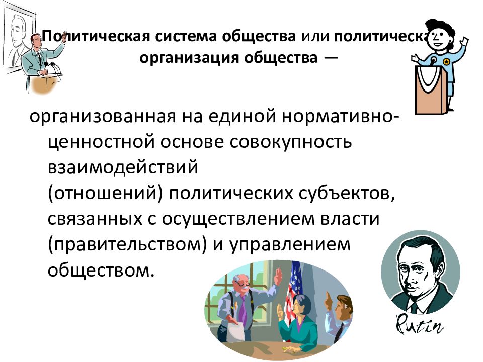 организованная на единой нормативно-ценностной основе совокупность взаимодействий (отношений) политических субъектов, связанных с осуществлением власти (правительством) и управлением обществом.