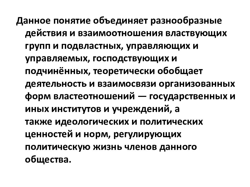 Данное понятие объединяет разнообразные действия и взаимоотношения властвующих групп и подвластных, управляющих и управляемых, господствующих и подчинённых, теоретически обобщает деятельность и взаимосвязи организованных форм властеотношений — государственных и иных институтов и учреждений, а также идеологических и политических ценностей и норм, регулирующих политическую жизнь членов данного общества.