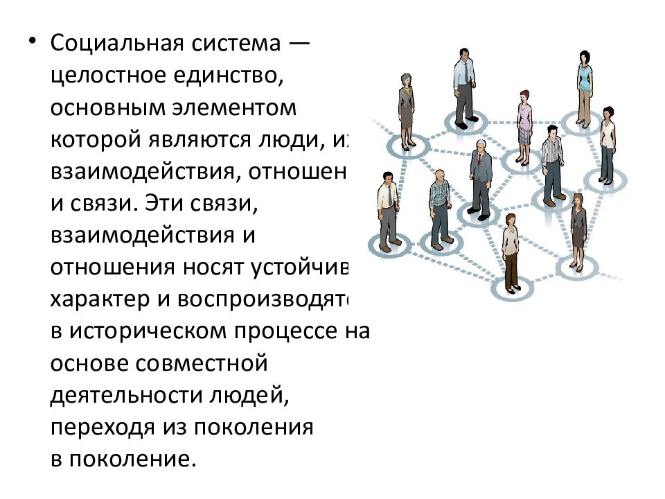 Социальная система — целостное единство, основным элементом которой являются люди, их взаимодействия, отношения и связи. Эти связи, взаимодействия и отношения носят устойчивый характер и воспроизводятся в историческом процессе на основе совместной деятельности людей, переходя из поколения в поколение.