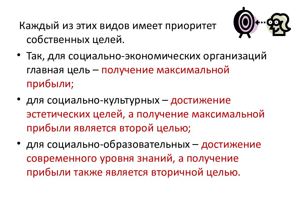 Каждый из этих видов имеет приоритет собственных целей. Так, для социально-экономических организаций главная цель – получение максимальной прибыли; для социально-культурных – достижение эстетических целей, а получение максимальной прибыли является второй целью; для социально-образовательных – достижение современного уровня знаний, а получение прибыли также является вторичной целью.