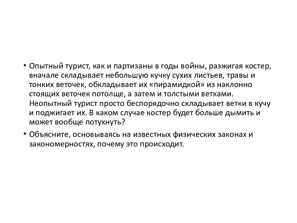 Опытный турист, как и партизаны в годы войны, разжигая костер, вначале складывает небольшую кучку сухих листьев, травы и тонких веточек, обкладывает их «пирамидкой» из наклонно стоящих веточек потолще, а затем и толстыми ветками. Неопытный турист просто беспорядочно складывает ветки в кучу и поджигает их. В каком случае костер будет больше дымить и может вообще потухнуть? Объясните, основываясь на известных физических законах и закономерностях, почему это происходит.