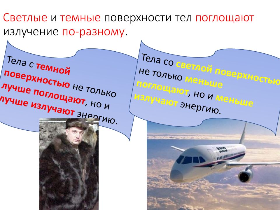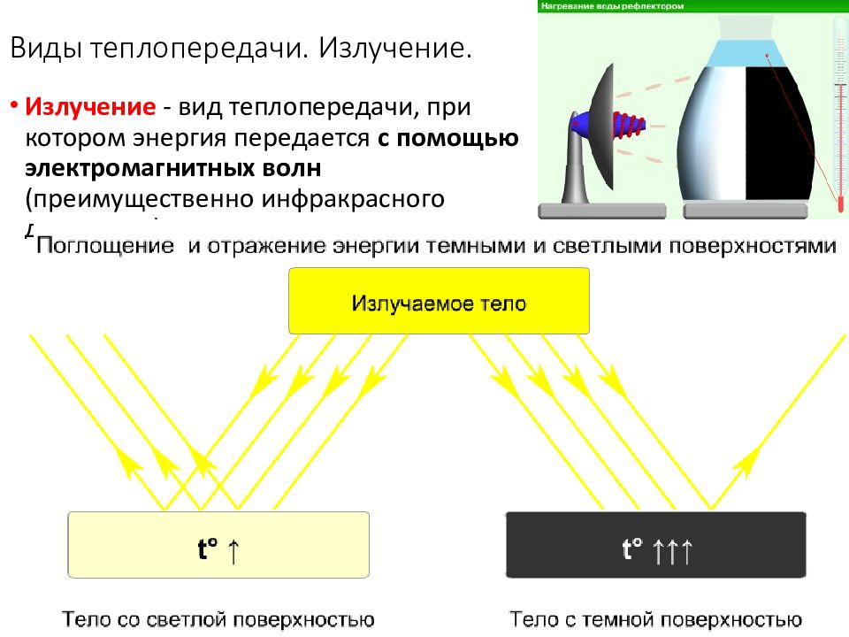 Тела с темной поверхностью не только лучше поглощают, но и лучше излучают энергию. Тела со светлой поверхностью не только меньше поглощают, но и меньше излучают энергию.