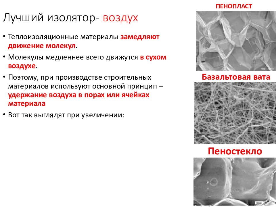 Теплоизоляционные материалы замедляют движение молекул. Молекулы медленнее всего движутся в сухом воздухе. Поэтому, при производстве строительных материалов используют основной принцип – удержание воздуха в порах или ячейках материала Вот так выглядят при увеличении: ПЕНОПЛАСТ Базальтовая вата Пеностекло