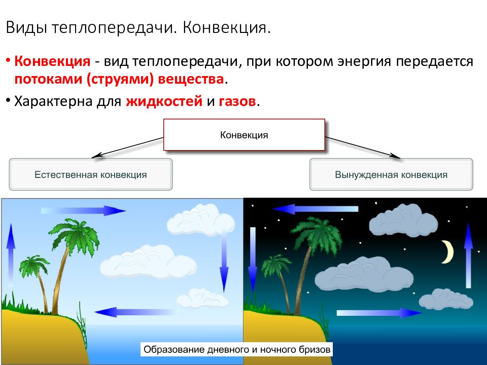 Конвекция - вид теплопередачи, при котором энергия передается потоками (струями) вещества. Характерна для жидкостей и газов.