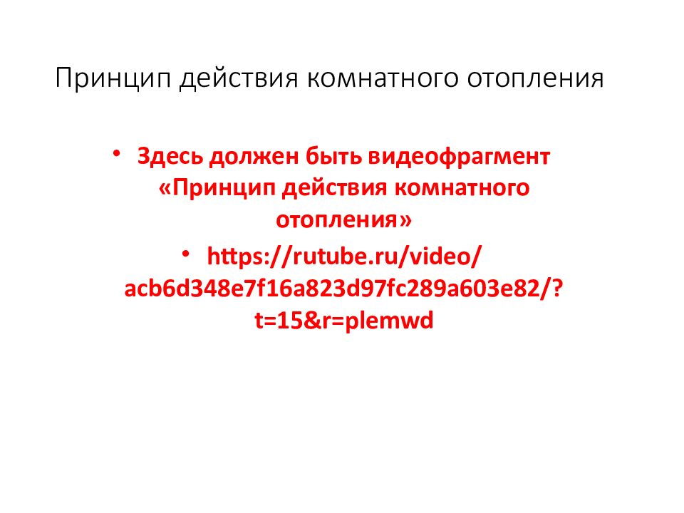 Здесь должен быть видеофрагмент «Принцип действия комнатного отопления» https:// rutube.ru /video/acb6d348e7f16a823d97fc289a603e82/?t=15&r= plemwd