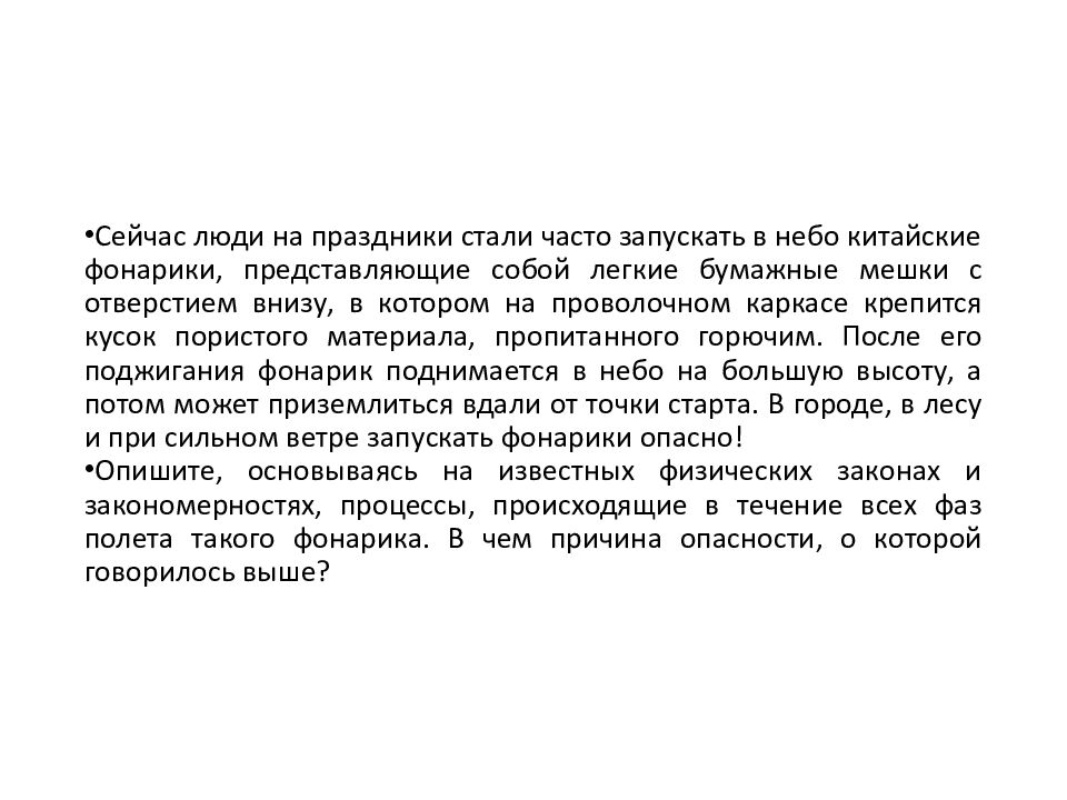 Сейчас люди на праздники стали часто запускать в небо китайские фонарики, представляющие собой легкие бумажные мешки с отверстием внизу, в котором на проволочном каркасе крепится кусок пористого материала, пропитанного горючим. После его поджигания фонарик поднимается в небо на большую высоту, а потом может приземлиться вдали от точки старта. В городе, в лесу и при сильном ветре запускать фонарики опасно! Опишите, основываясь на известных физических законах и закономерностях, процессы, происходящие в течение всех фаз полета такого фонарика. В чем причина опасности, о которой говорилось выше?