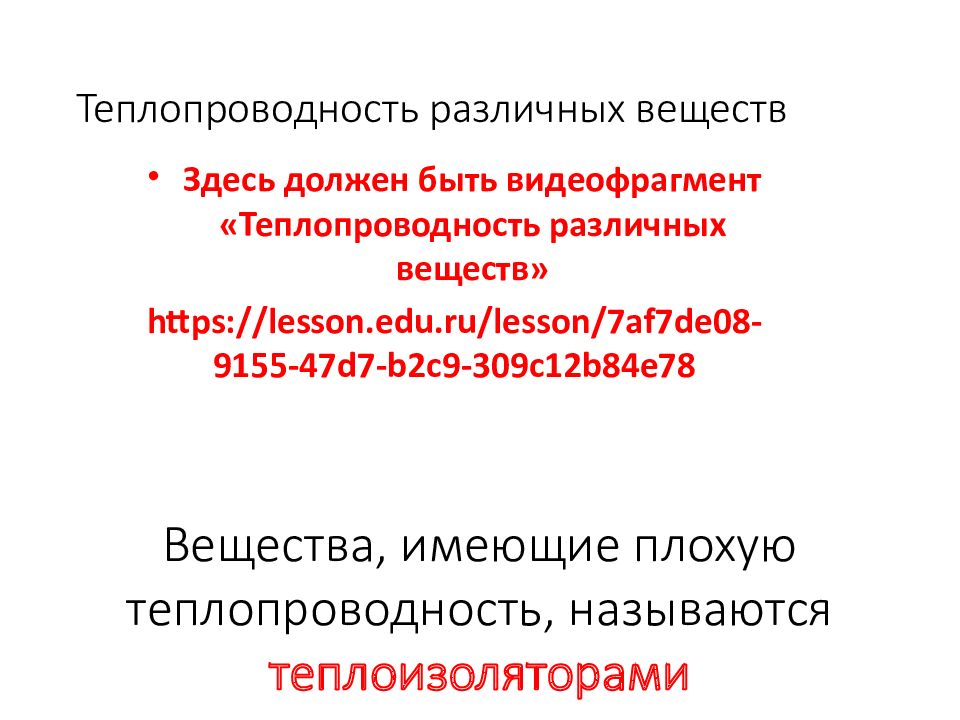 Вещества, имеющие плохую теплопроводность, называются теплоизоляторами Здесь должен быть видеофрагмент «Теплопроводность различных веществ» https:// lesson.edu.ru /lesson/7af7de08-9155-47d7-b2c9-309c12b84e78