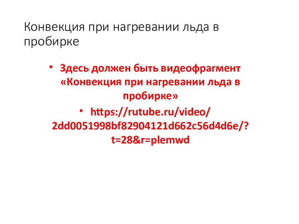 Здесь должен быть видеофрагмент «Конвекция при нагревании льда в пробирке» https:// rutube.ru /video/2dd0051998bf82904121d662c56d4d6e/?t=28&r= plemwd
