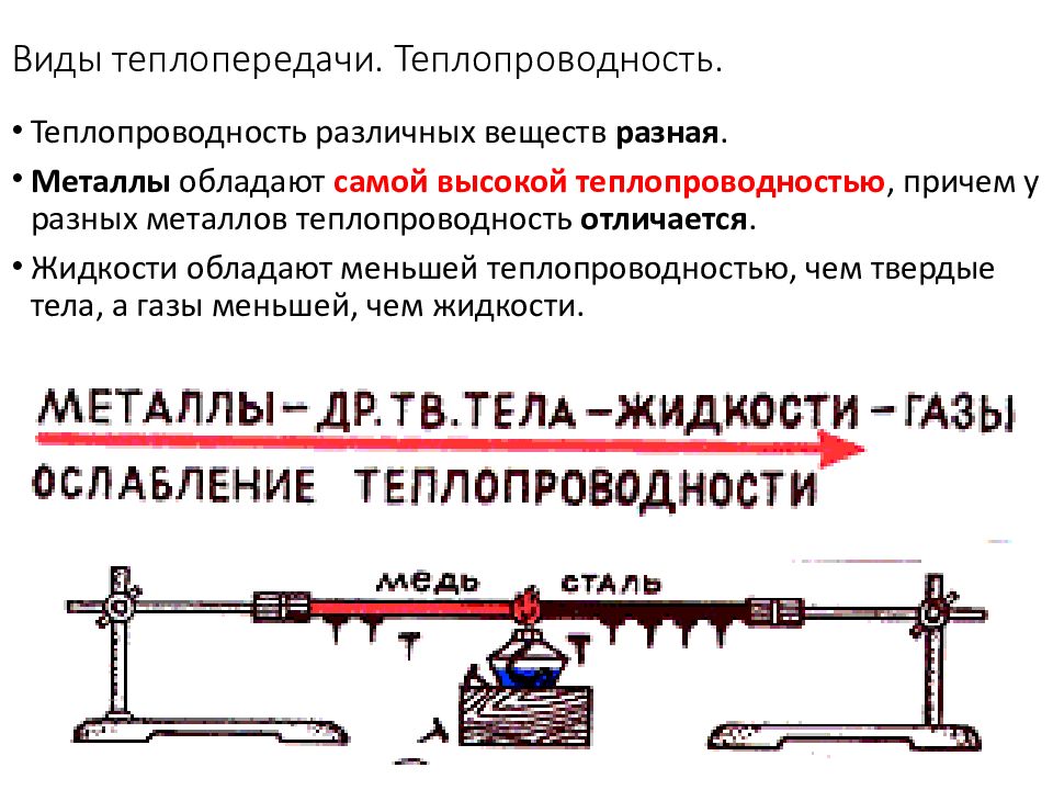 Теплопроводность различных веществ разная. Металлы обладают самой высокой теплопроводностью, причем у разных металлов теплопроводность отличается. Жидкости обладают меньшей теплопроводностью, чем твердые тела, а газы меньшей, чем жидкости.
