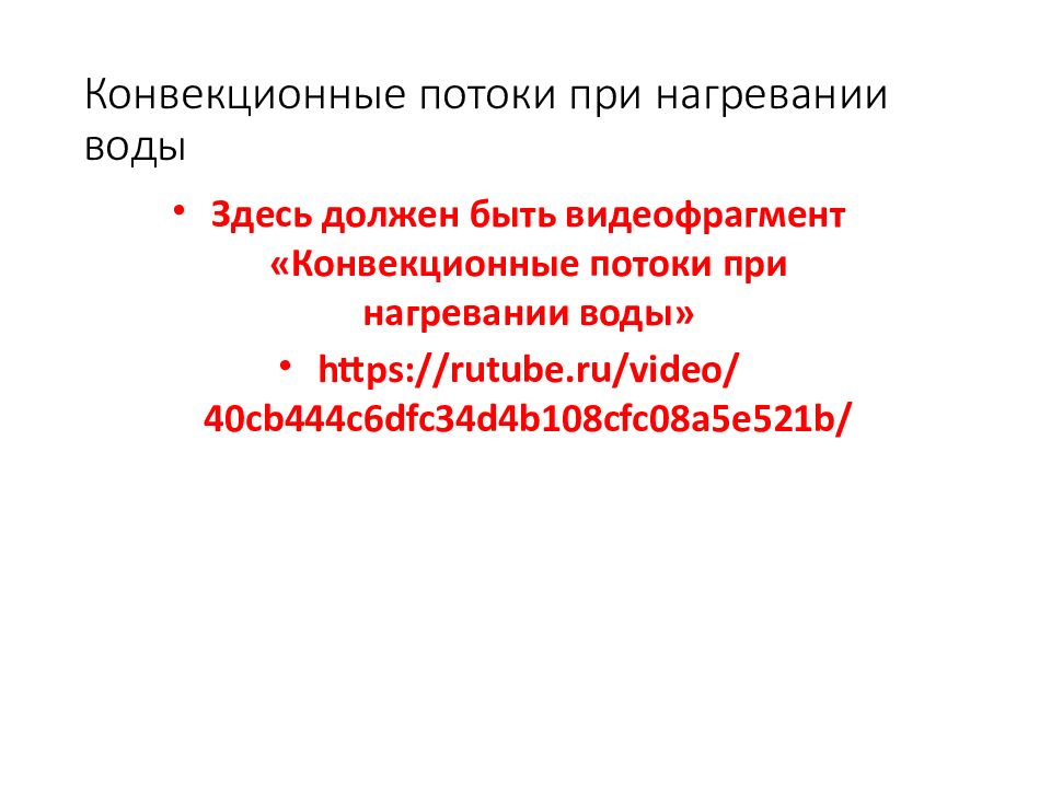 Здесь должен быть видеофрагмент «Конвекционные потоки при нагревании воды» https:// rutube.ru /video/40cb444c6dfc34d4b108cfc08a5e521b/
