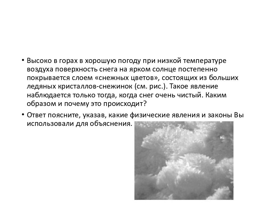 Высоко в горах в хорошую погоду при низкой температуре воздуха поверхность снега на ярком солнце постепенно покрывается слоем «снежных цветов», состоящих из больших ледяных кристаллов-снежинок (см. рис.). Такое явление наблюдается только тогда, когда снег очень чистый. Каким образом и почему это происходит? Ответ поясните, указав, какие физические явления и законы Вы использовали для объяснения.