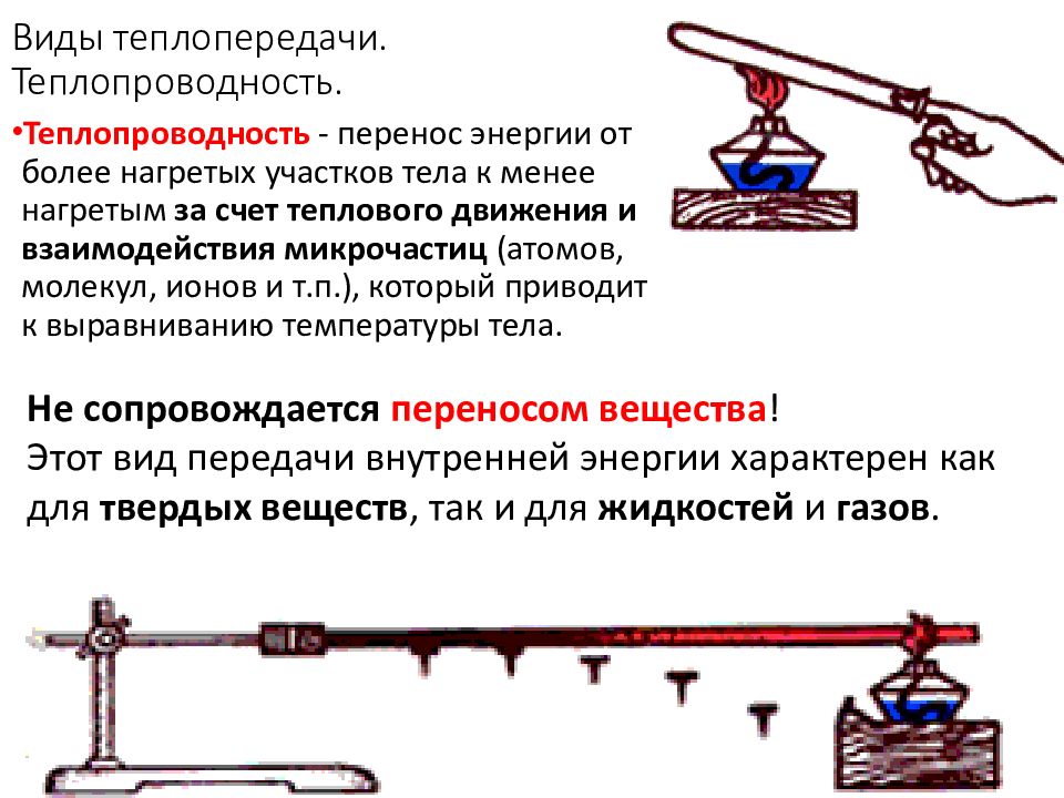 Теплопроводность - перенос энергии от более нагретых участков тела к менее нагретым за счет теплового движения и взаимодействия микрочастиц (атомов, молекул, ионов и т.п.), который приводит к выравниванию температуры тела. Не сопровождается переносом вещества ! Этот вид передачи внутренней энергии характерен как для твердых веществ, так и для жидкостей и газов.