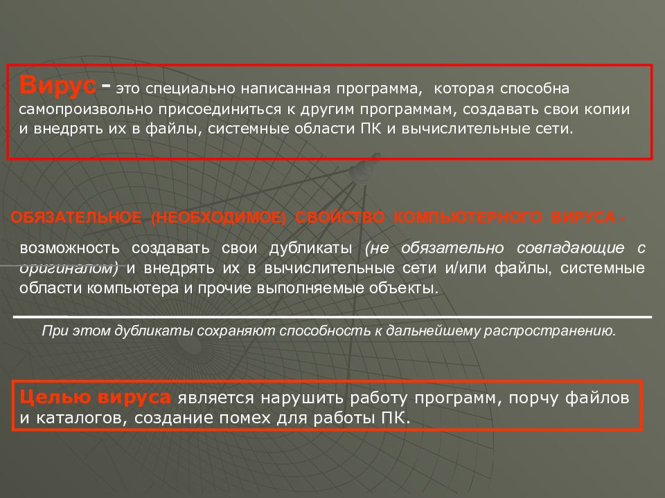 Вирус - это специально написанная программа, которая способна самопроизвольно присоединиться к другим программам, создавать свои копии и внедрять их в файлы, системные области ПК и вычислительные сети. возможность создавать свои дубликаты (не обязательно совпадающие с оригиналом) и внедрять их в вычислительные сети и/или файлы, системные области компьютера и прочие выполняемые объекты. ОБЯЗАТЕЛЬНОЕ (НЕОБХОДИМОЕ) СВОЙСТВО КОМПЬЮТЕРНОГО ВИРУСА - При этом дубликаты сохраняют способность к дальнейшему распространению. Целью вируса является нарушить работу программ, порчу файлов и каталогов, создание помех для работы ПК.