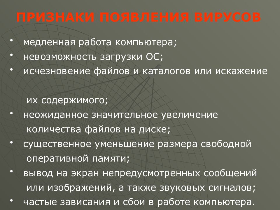 ПРИЗНАКИ ПОЯВЛЕНИЯ ВИРУСОВ медленная работа компьютера; невозможность загрузки ОС; исчезновение файлов и каталогов или искажение их содержимого; неожиданное значительное увеличение количества файлов на диске; существенное уменьшение размера свободной оперативной памяти; вывод на экран непредусмотренных сообщений или изображений, а также звуковых сигналов; частые зависания и сбои в работе компьютера.