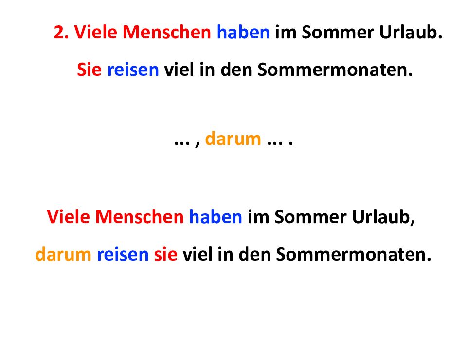 2. Viele Menschen haben im Sommer Urlaub. Sie reisen viel in den Sommermonaten. ..., darum.... Viele Menschen haben im Sommer Urlaub, darum reisen sie viel in den Sommermonaten.