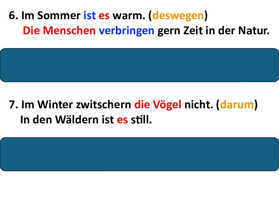 6. Im Sommer ist es warm. ( deswegen ) Die Menschen verbringen gern Zeit in der Natur. Im Sommer ist es warm, deswegen verbringen die Menschen gern Zeit in der Natur. 7. Im Winter zwitschern die Vögel nicht. ( darum ) In den Wäldern ist es still. Im Winter zwitschern die Vögel nicht, darum ist es in den Wäldern still.