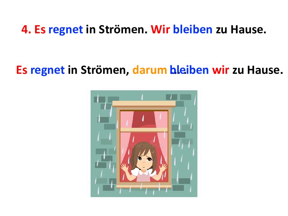 4. Es regnet in Strömen. Wir bleiben zu Hause. Es regnet in Strömen, darum.... bleiben wir zu Hause.